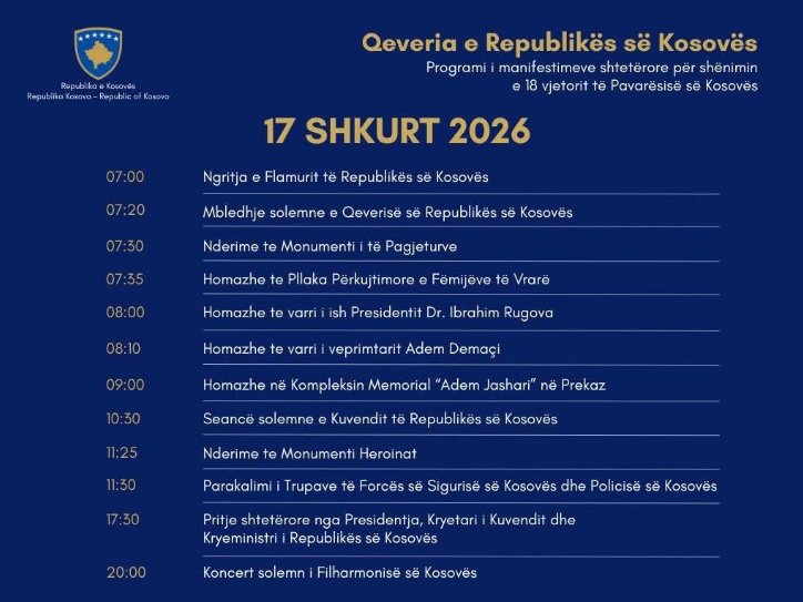 Republika e Kosova feston nesër 18-vjetorin e shpalljes së Pavarësisë me një sërë aktivitetesh shtetërore të organizuara nga Zyra e Kryeministrit dhe institucionet qendrore.