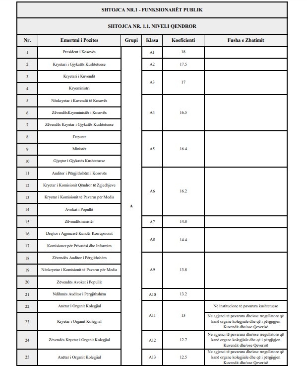 Në dokumentin e publikuar nga Zyra e Kryeministrit, koeficientin më të lartë e ka Presidenti i vendit, 18.