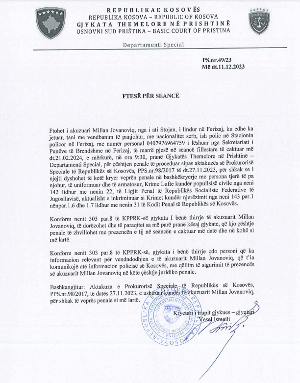 “Ftohet i akuzuari Millan Jovanoviq, nga i ati Stojan, i lindur në Ferizaj, ku edhe ka jetuar, tani me vendbanim të panjohur, me nacionalitet serb, ish polic në Stacionin policor në Ferizaj, me numër personal 0407976964759 i lëshuar nga Sekretariati i Punëve të Brendshme në Ferizaj, të marrë pjesë në seancë fillestare të caktuar më dt.21.02.2024, e mërkurë, në ora 9:30, pranë Gjykatës Themelore në Prishtinë – Departamenti Special, për çështjen penale të proceduar sipas aktakuzës së Prokurorisë Speciale të Republikës së Kosovës, PPS.nr.98/2017 të dt.27.11.2023, për shkak se i njëjti dyshohet të ketë kryer veprën penale në bashkëkryerje me persona tjerë të pa njohur, të uniformuar dhe të armatosur, Krime Lufte kundër popullsisë civile nga neni 142 lidhur me nenin 22, të Ligjit Penal të Republikës Socialiste Federative të Jugosllavisë, aktualisht e inkriminuar si Krimet kundër njerëzimit nga neni 143 paragrafi l nënparagrafi 1.6 dhe 1.7 lidhur me nenin 31 të Kodit Penal të Republikës së Kosovës.”, thuhet në njoftim.