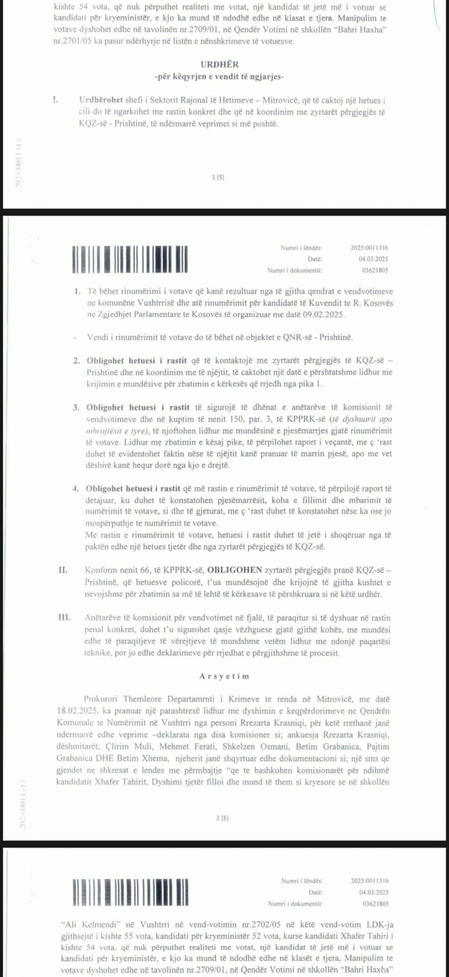 Prokuroria Themelore në Mitrovicë ka urdhëruar që të bëhet rinumërimi i votave të Lidhjes Demokratike të Kosovës në të gjitha qendrat e vendvotimeve në komunën e Vushtrrisë.