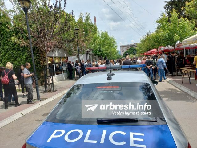 Një makinë e Policisë së Kosovës ka mbetur e bllokuar në mes të turmës së protestuesve në Zveçan, pasi rotestuesit kanë bllokuar rrugën.