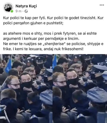 Kur polici te kap per fyti. Kur polici te godet tinezisht. Kur polici perqafon gjuhen e pushtetit;as atehere mos e shty, mos i prek fytyren, se ai eshte argumenti i kerkuar per perndjekje e lincim.