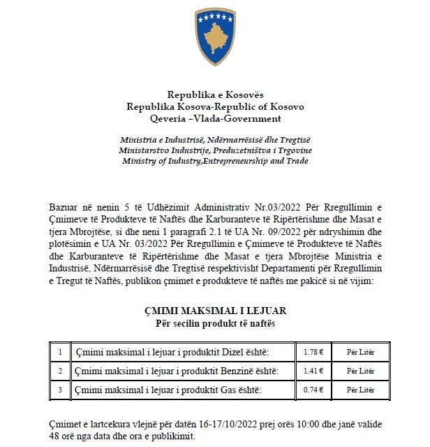 çmimi maksimal i lejuar për produktin Beniznë do të jetë 1.41 Euro për litër;