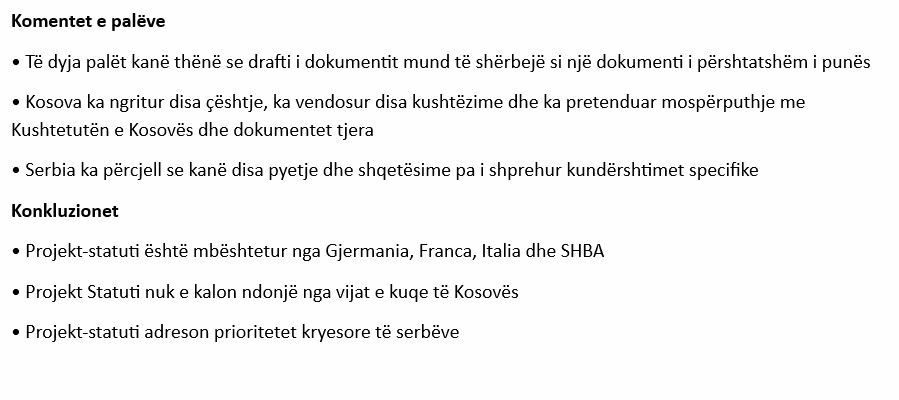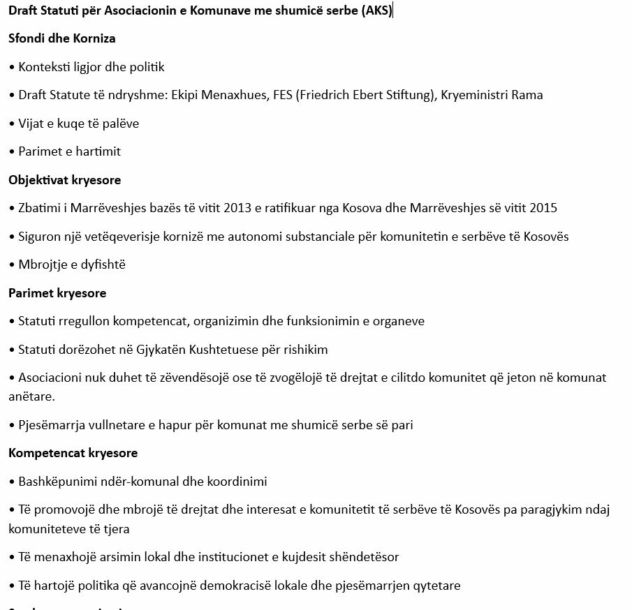 Draft-statuti për themelimin e Asociacionit të komunave me shumicë serbe, i propozuar nga Bashkimi Evropian më 21 tetor, “siguron një vetëqeverisje kornizë me autonomi substanciale për komunitetin e serbëve të Kosovës”.
