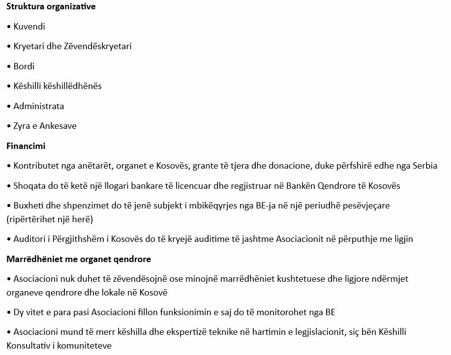 Bazuar në këtë draft-statut, Asociacioni do të ketë kuvendin e tij, kryetarin, nënkryetarin, bordin, këshillin këshillëdhënës dhe zyrën për ankesa. Ndërsa, në konkluzionet e draft-statutit theksohet se “projekt statuti nuk e kalon ndonjë nga vijat e kuqe të Kosovës”.