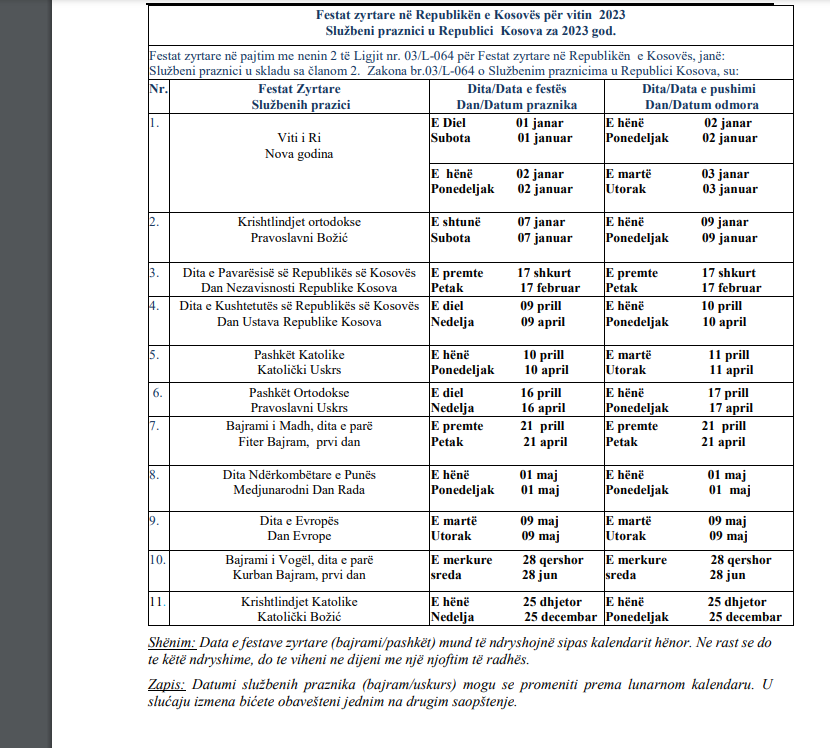 Punëtorët e shtetit do ta kenë pushim sot e nesër pasi pasi që ata do të përfitojnë nga dy data të festave zyrtare të cilat ranë në vikend, mirëpo sipas Ligjit të Festave zyrtare, për to pushohet në një ditë pune.