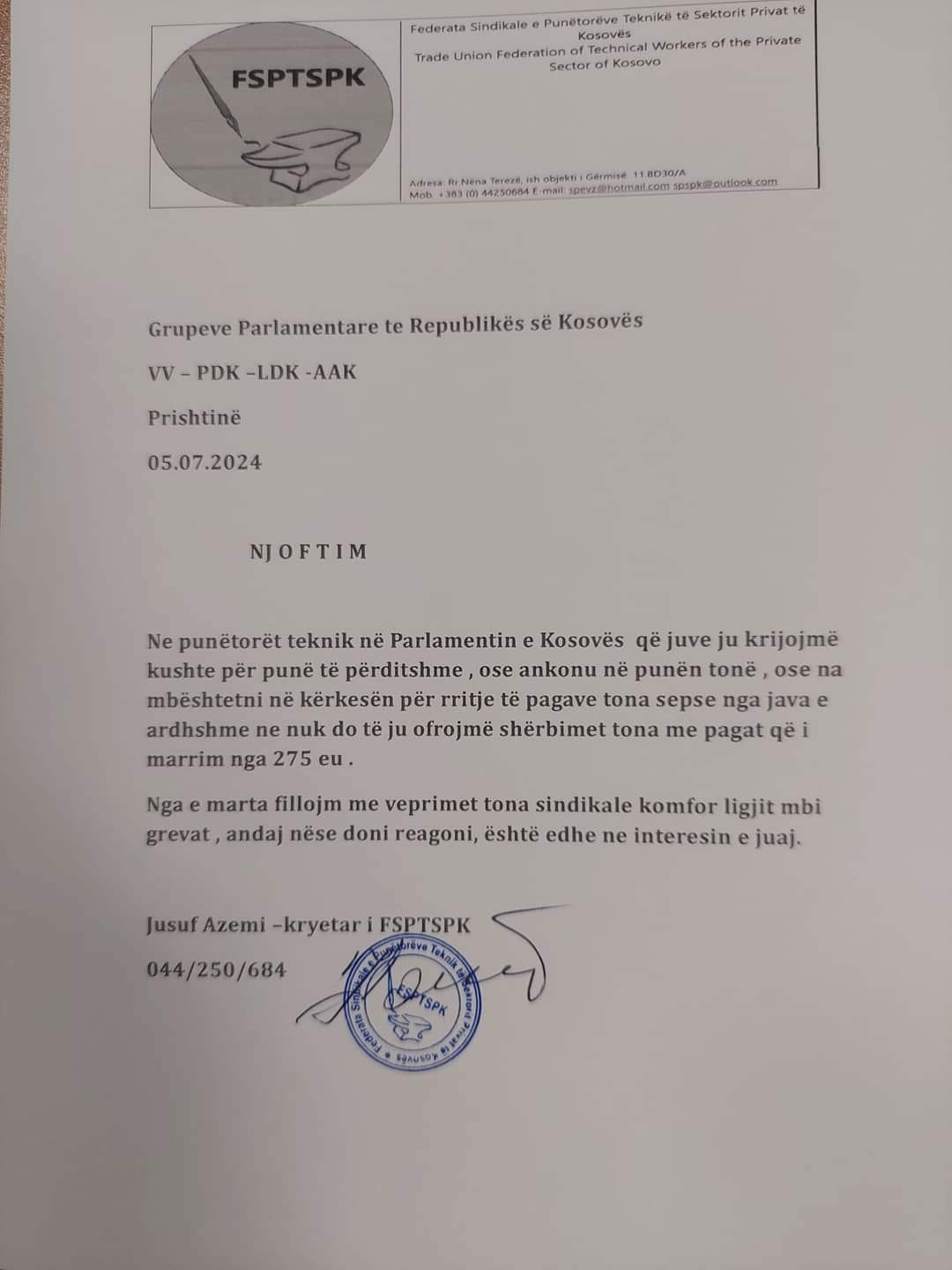 “Ne punëtorët teknik në Parlamentin e Kosovës që juve ju krijojmë kushte për punë të përditshme, ose ankohuni në punën tonë, ose na mbështetni në kërkesën për rritje të pagave tona sepse nga java e ardhshme ne nuk do të ju ofrojmë shërbimet tona me pagat që i marrim nga 275 euro. Nga e marta fillojmë me veprimet tona sindikale konfrom ligjit mbi grevat, andaj nëse doni reagoni është edhe në interesin e juaj”, thuhet në shkresën drejtuar Grupeve Parlamentare. /Arbresh.info/