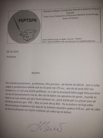 “Me qëndrim të qartë mund të themi se nuk është ajo që e kemi kërkuar ne, por është për t’u çmuar pasi që kërkesa jonë ka qenë 450 euro dhe na janë ofruar 402. Po ta kishim në fuqi edhe Marrëveshjen Kolektive kjo pagë do të kalonte shumën së paku 470 euro, për të cilën ne do të luftojmë me mjete sindikale që edhe kjo të bëhet”, thuhet në njoftimin e Azemit.