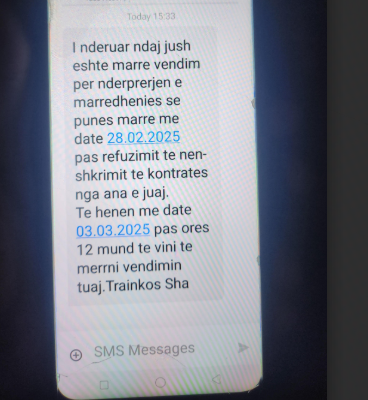 Prindi im, Sami Halimi, po përjashtohet nga puna pasi nuk pranoi t’i ndryshohet kontrata nga në kohë të pacaktuar në 3-vjeçare. Po ashtu, i është ndërruar vendi i punës duke u thirrur kinse ne rikunstuimin e ndërmarrjes që prapë të drejtë në ndryshimin e kontratës.
