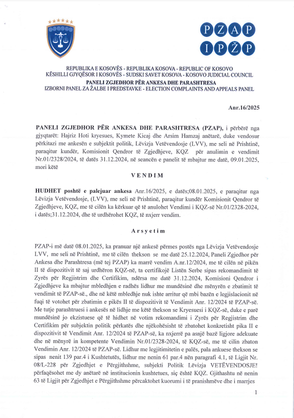 “HUDHET poshtë e palejuar ankesa Nr. 16/2025 e datës 08.01.2025, e paraqitur nga Lëvizja Vetëvendosje (LVV), me seli në Prishtinë, kundër Komisionit Qendror të Zgjedhjeve (KQZ), ku kërkohej anulimi i Vendimit të KQZ-së Nr. 01/2328-2024, të datës 31.12.2024, dhe urdhërohej KQZ-ja të nxirrte vendim tjetër”, thuhet në vendimin e PZAP-së.