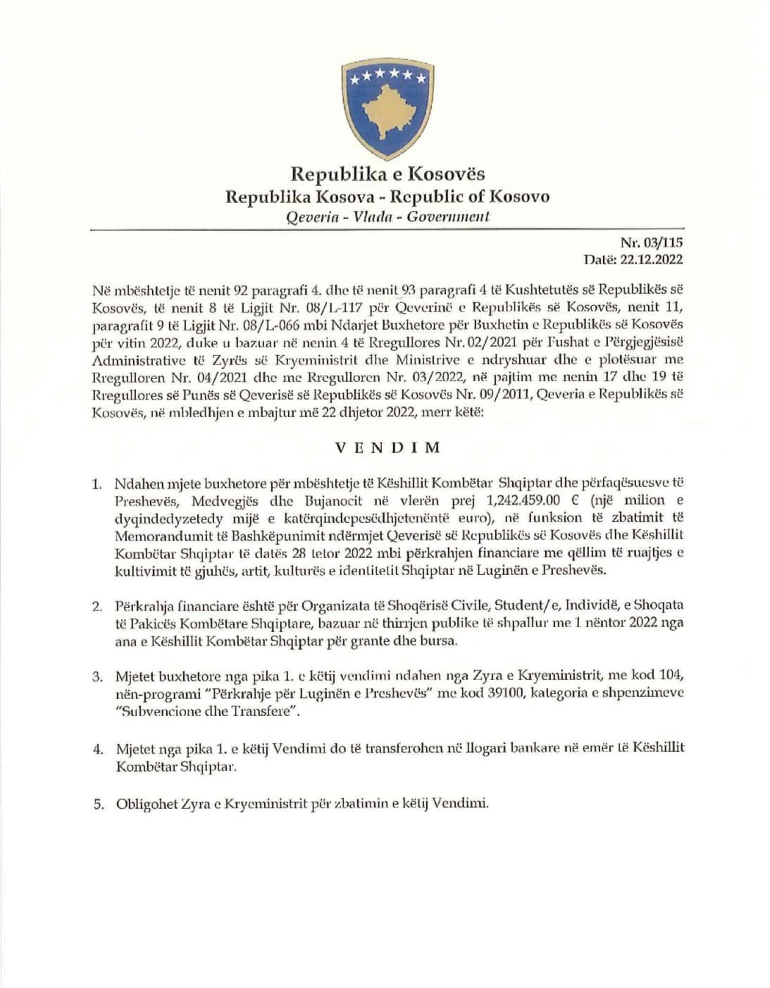 Pasiqë sot, në mbledhjen e 115 të Qeverisë së Kosovës, ka kaluar Vendimi për ndarjen e mjeteve buxhetore për mbeshtetje të Këshillit Kombëtar Shqiptar dhe përfaqësuesve të Preshevës, Medvegjës dhe Bujanocit në vlerën prej 1,242.459.00 €, në funksion të zbatimit të Memorandumit te Bashkëpunimit ndërmjet Qeverisë së Republikës së Kosovës dhe Këshillit Kombëtar Shqiptar të datës 28 tetor 2022, mbi përkrahjen financiare me qëllim të ruajtjes e kultivimit të gjuhës, artit, kulturës e identitetit Shqiptar në Luginën e Preshevës.