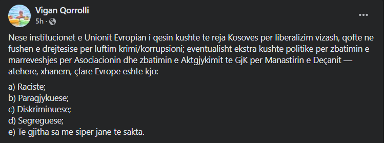 “Nëse institucionet e Unionit Evropian i qesin kushte të reja Kosovës për liberalizim vizash, qoftë në fushën e drejtësisë për luftim krimi/korrupsioni; eventualisht ekstra kushte politike për zbatimin e marrëveshjes për Asociacionin dhe zbatimin e Aktgjykimit te GjK për Manastirin e Deçanit — atëherë, xhanëm, çfarë Evrope është kjo :a) Raciste; b) Paragjykuese; c) iskriminuese; d) Segreguese; e) Te gjitha sa me sipër janë të sakta”, ka shkruar ai në Facebook./arbresh.info/