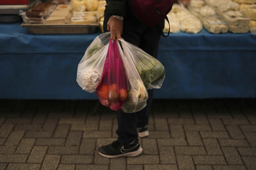 A woman buys groceries at the Fener street food market, in Istanbul, Turkey, Tuesday, April 8, 2025. (AP Photo/Francisco Seco)