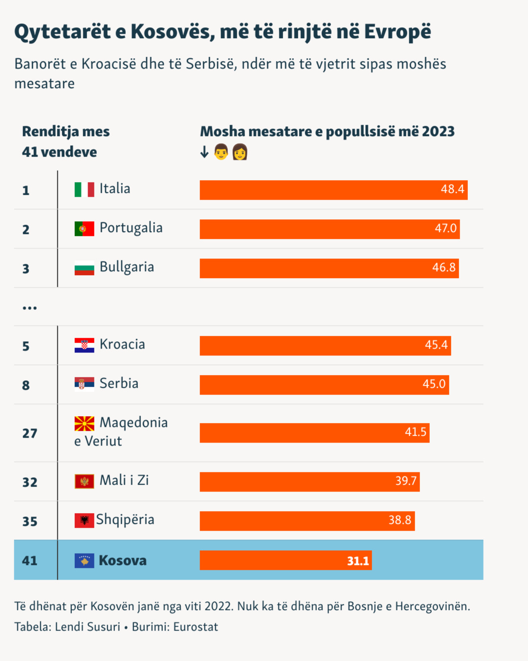 Kosovarët, për nga mosha mesatare, janë më të rinjtë në evropë, ndërsa kroatët dhe serbët më të moshuarit në rajon, sipas të dhënave të “Eurostat” që i raportoi Radio Evropa e Lirë.