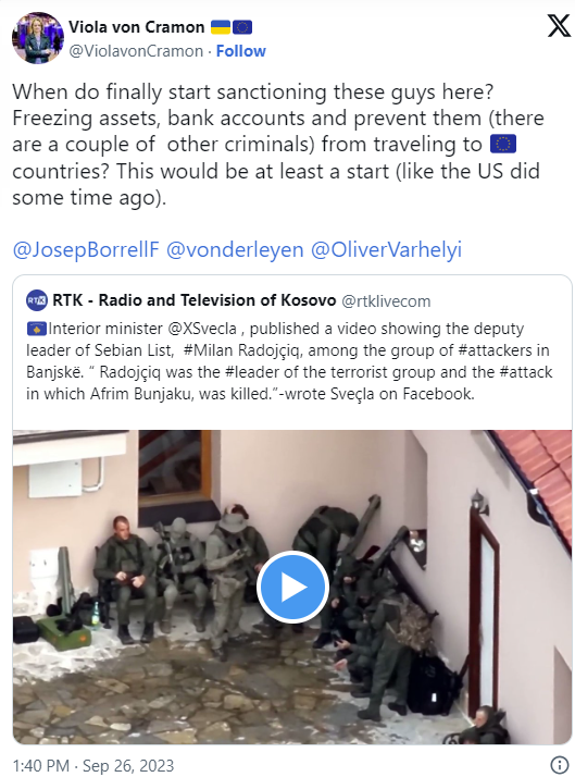 Raportuesja për Kosovën në Parlamentin Evropian, Viola von Cramon ka reaguar pas videos së publikuar nga ministri i Brendshëm, Xhelal Sveçla, ku shihet nënkryetari i Listës Serbe, Milan Radojiçiq në krye.