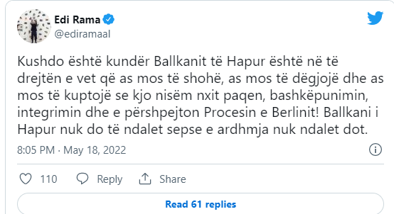 Rama, në një shkrim në Twitter, tha se kushdo që është kundër iniciativës së “Ballkanit të Hapur”, është në të drejtën e vetë që as mos të shohë, as mos të dëgjojë dhe as mos të kuptojë…