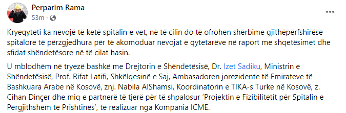 “Kryeqyteti ka nevojë të ketë spitalin e vet, në të cilin do të ofrohen shërbime gjithëpërfshirëse spitalore të përzgjedhura për të akomoduar nevojat e qytetarëve në raport me shqetësimet dhe sfidat shëndetësore në të cilat hasin”, ka shkruar Rama./arbresh.info/