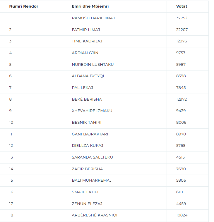 I dyti në listë është Fatmir Limaj, me 22,207 vota, ndërsa Daut Haradinaj renditet i treti me 21,796 vota. Time Kadrijaj është e katërta me 12,976 vota, ndërsa Bekë Berisha i pesti me 12,972 vota. Arbëreshë Kryeziu ka fituar 10,824 vota, Lahi Brahimaj 10,611 vota dhe Veseli Krasniqi ka 10,407 vota.