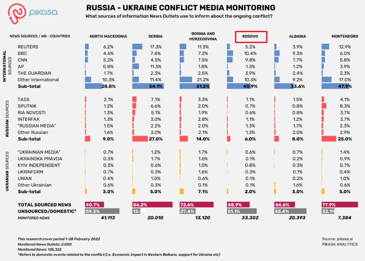 Pikasa Strategic Insight, është kompani që merret me Analizimin e të Dhënave, dhe përgjatë muajit shkurt ka monitoruar mediat lidhur me raportimin për konfliktin Rusi-Ukrainë.
