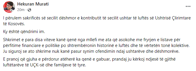 Murati thotë se i përulet sakrificës së secilit dëshmor e kontributit të secilit ushtar të luftës së Ushtrisë Çlirimtare të Kosovës.