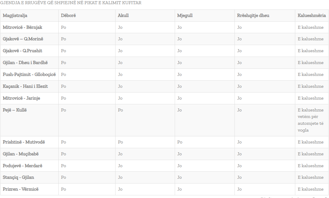 Kështu ka bërë të ditur Qendra Kombëtare për Menaxhim Kufitar, ku sipas njoftimit, të gjitha rrugët janë të kalueshme përveç pikës kufitare Pejë-Kulle ku kalimi është i mundur vetëm me automjete të vogla./Arbresh.info
