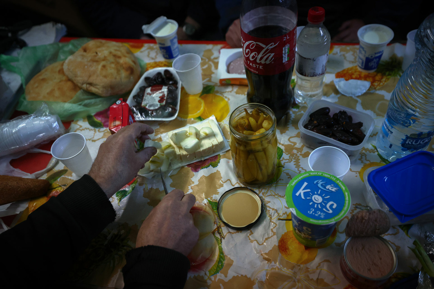 Burrat qeshin dhe bisedojnë me njëri-tjetrin ndërsa ndajnë vaktin e Iftarit, të ngrënë pas një dite agjërimi midis lindjes së diellit dhe perëndimit të diellit gjatë muajit të shenjtë mysliman të Ramazanit.