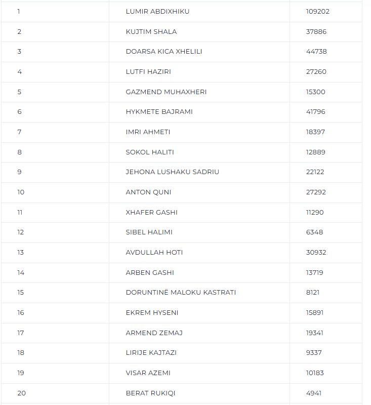 Komisioni Qendror i Zgjedhjeve (KQZ) ka publikuar rezultatet e votave të kandidatëve për deputet të subjekteve politike në zgjedhjet për Kuvendin e Kosovës.