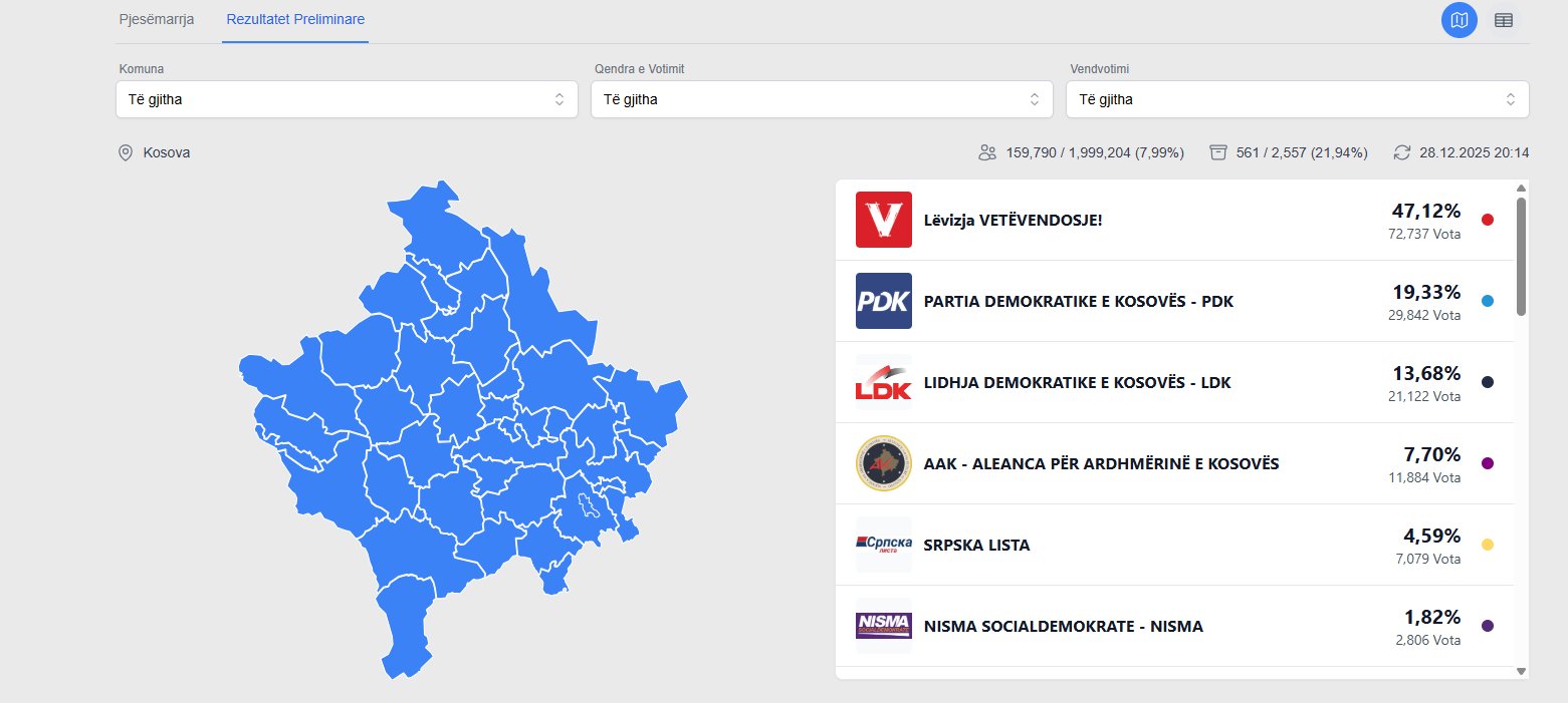 E dyta është PDK-ja me 19.77 për qind, pasuar nga LDK-ja me 13.5 për qind.