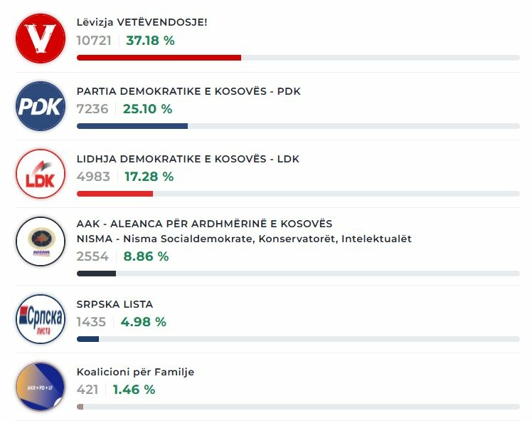 Sipas të dhënave në faqen zyrtare të KQZ-së rezultatet e para nga 5.29% e votave të numëruara janë si vijon: Vetëvendosje 37.18%, PDK 25.10%, LDK 17.28%, AAK-Nisma me partnerët 8.86%, Lista Serbe 4.98% dhe Koalicioni për Familje 1.46%./Arbresh.info/