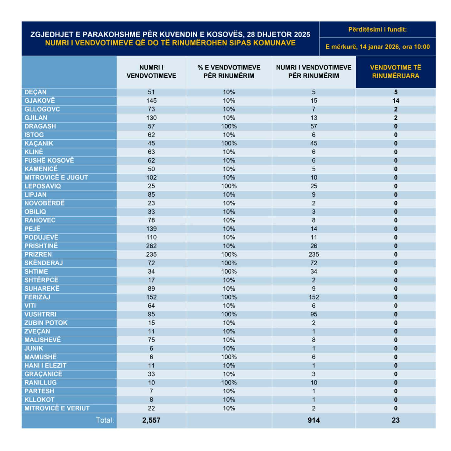 Nga nisja e këtij procesi dhe deri tani (e mërkurë, 14 janar 2026, ora 10:00) janë rinumëruar 23 vendvotime nga 914 për të cilat KQZ-ja ka marrë vendim që të rinumërohen.