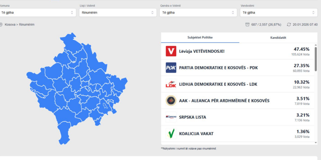 Deri më tash, bazuar në përditësimin e fundit, janë rinumëruar 687 vendvotime, ku po vazhdon të ketë lëvizje te votat e kandidatëve për deputetë.