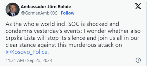 “Si e gjithë bota, përfshirë edhe Kishën Ortodokse Serbe, janë tronditur dhe dënojnë ngjarjet e djeshme: Pyes veten nëse edhe Lista Srpska do ta ndalë heshtjen dhe do të na bashkohet të gjithëve në qëndrimin tonë të qartë kundër këtij sulmi vrasës ndaj Policisë së Kosovës”, ka shkruar Rohde në Twitter./Arbresh.info/