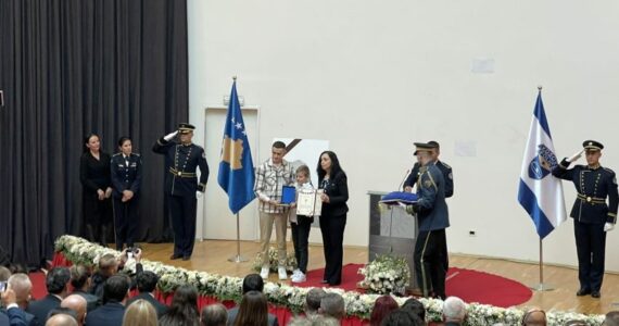 Presidentja e Kosovës, Vjosa Osmani, ka ndarë urdhrin “Hero i Kosovës” policit Afrim Bunjaku, i cili u vra më 24 shtator në veriun e vendit. Urdhrin e pranuan familja e policit në një mbledhje komemorative në nderim të policit që ra në krye të detyrës. “Në emër të qytetarëve i ndaj urdhrin “Heroi i Kosovës”, … Continue reading Rreshteri Afrim Bunjaku shpallet hero i Kosovës, nderimin e pranuan dy djemtë e tij nga Presidentja