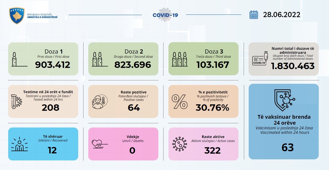 Gjatë 24 orëve të fundit janë regjistruar 64 raste të reja pozitive me Covid-19 në Kosovë.
