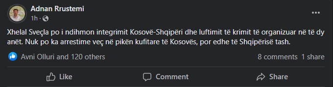 “Xhelal Sveçla po i ndihmon integrimit Kosovë-Shqipëri dhe luftimit të krimit të organizuar në të dy anët. Nuk po ka arrestime veç në pikën kufitare të Kosovës, por edhe të Shqipërisë tash”, ka shkruar Rrustemi.