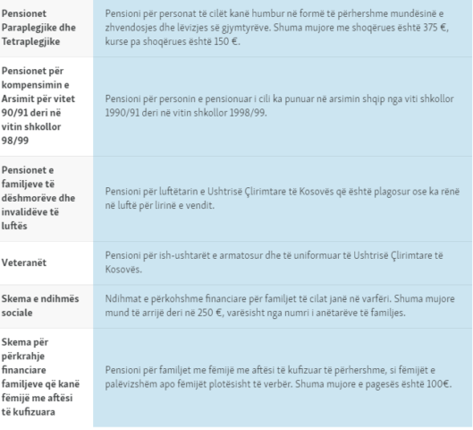 Në skemat e tilla përfshihen kategori të ndryshme: nga pagesat mujore për veteranët e luftës e deri te pensionet për kompensimin e punonjësve të arsimit për punën e bërë gjatë viteve 1990.