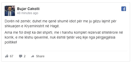 Më pas Cakolli e duket se i ka rënë pishman për statusin e tij dhe e ka fshirë nga llogaria e Facebook-ut.