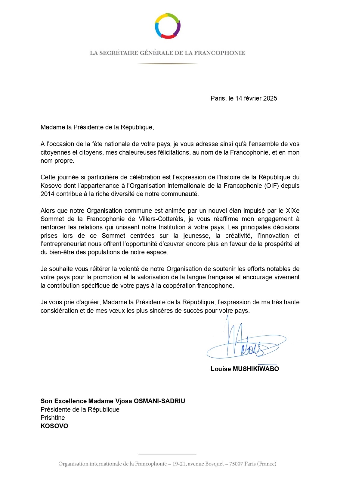 Në mesazhin e saj, Sekretarja e Përgjithshme ka vlerësuar kontributin e Kosovës në komunitetin frankofon që nga anëtarësimi i saj në OIF në vitin 2014, duke theksuar se ky anëtarësim pasuron diversitetin kulturor dhe gjuhësor të organizatës.