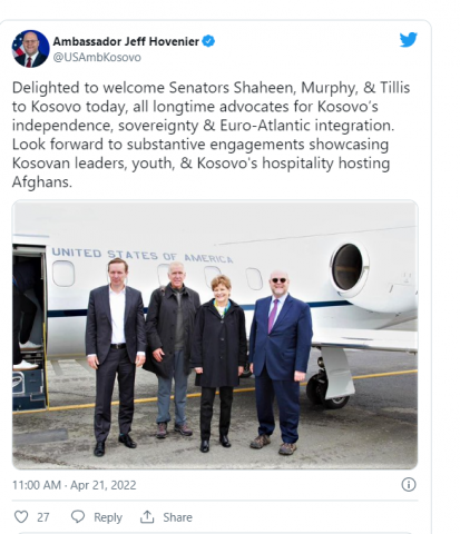 Ambasadori Hovenier ka postuar fotografi me senatorët dhe ka shkruar se tre anëtarët e Senatit amerikan janë mbështetës të moçëm të pavarësisë së Kosovës.