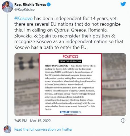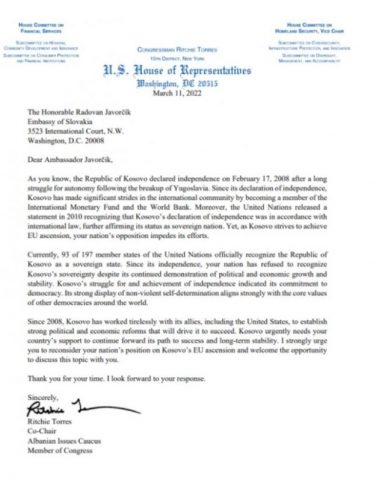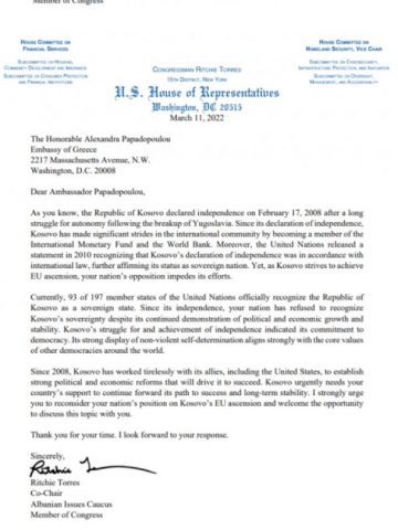 Senatori Ritchie Torres, është ai i cili tashmë është duke bërë fushatë haptazi për pranimin e shtetit të Kosovës në BE dhe NATO.
