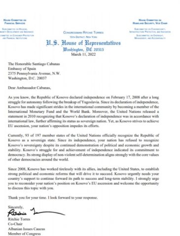 “Lufta e Kosovës, për dhe arritjen e pavarësisë, tregoi përkushtimin e saj ndaj demokracisë. Shfaqja e fortë e vetëvendosjes jo të dhunshme përputhet fuqishëm me vlerat thelbësore të demokracive të tjera në mbarë botën.”, ka shkruar në letrat e tij Torres.