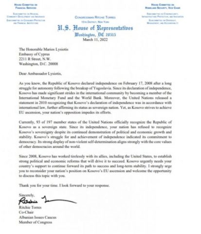 Senatori me anë të një letre drejtuar ambasadoreve të Qipros, Greqisë, Rumanisë, Sllovakisë dhe Spanjës, i ka kërkuar njohjen e Kosovës si shtet të pavarur dhe duke u kërkuar atyre që të ndryshojnë qëndrimin në drejtim të Kosovës, përcjell arbresh.info.