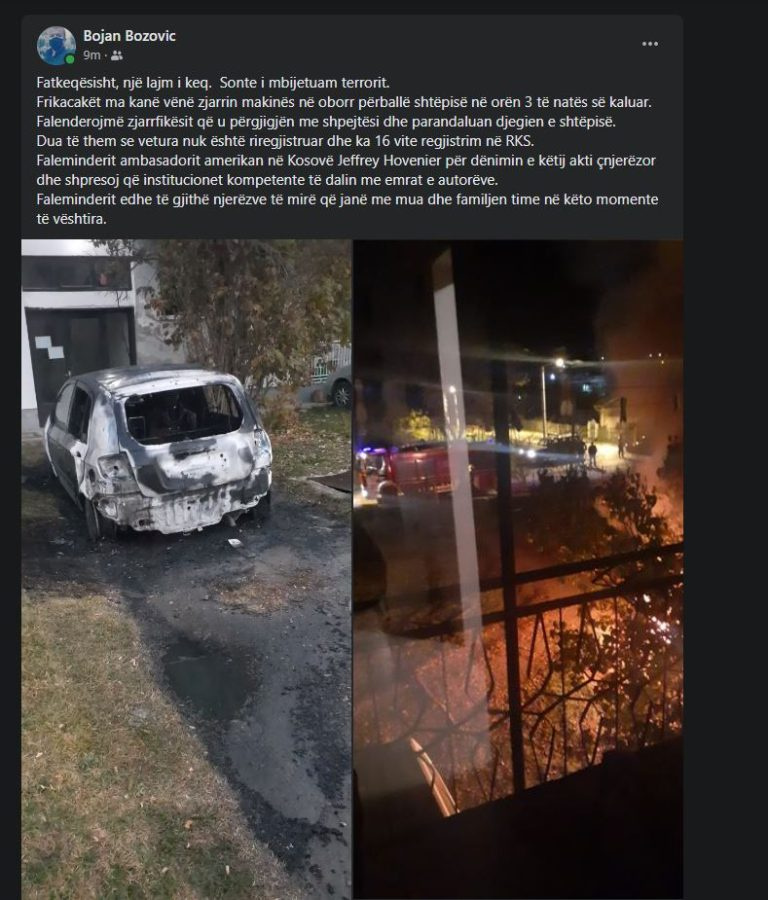 Qytetari serb, Bojan Bozoviq, ka publikuar pamje të veturës së djegur pranë shtëpisë së tij në Zubin Potok.