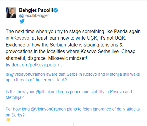 “Herën tjetër kur të provoni të vini në skenë diçka si Panda përsëri në Kosovë, të paktën mësoni të shkruani UÇK, nuk është UQK. Dëshmi se si shteti serb po organizon provokime tensionuese në lokalitetet ku jetojnë serbët e Kosovës. E ulët dhe turpshme, turp. Mendësia e Millosheviqit!”, shkruan Pacolli.