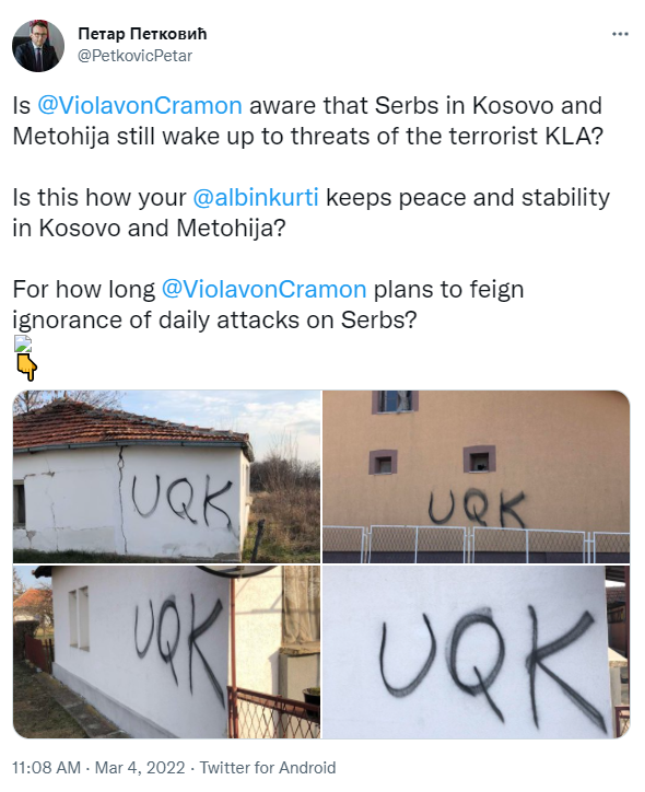 Gjatë ditë së sotme drejtori i të ashtuquajturës Zyra për Kosovë në Qeverinë e Serbisë, Petar Petkoviq në Twitter ka publikuar disa fotografi që sipas tij janë shtëpi të banorëve serb në murin e të cilave ku shkruan UQK.