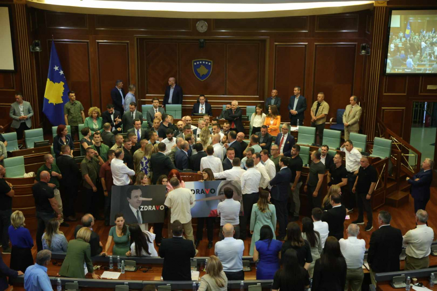 Tek foltorja e Kuvendit është krijuar një tollovi nga deputetët e PDK-së, të cilët në duar po mbajnë pankarta me fotografi të kryeministrit, Albin Kurti dhe shefes së grupit Parlamentar të LVV-së, Mimoza Kusari-Liles, me hund të zgjatur dhe me mbishkrimin “Zdravo”./Arbresh.info/