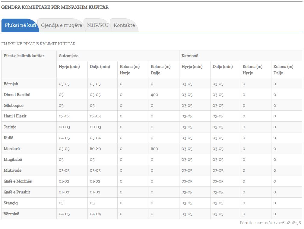 Sipas Qendrës Kombëtare për Menaxhim Kufitar, pritjet e bashkatdhetarëve tanë në vendkalimet kufitare të Kosovës me Serbinë, mëngjesin e sotëm, janë 80 minuta në Merdarë dhe te Dheu i Bardhë, kurse në pikat tjera kufitare pritjet janë ato të zakonshme, nga 3 deri në 5 minuta.