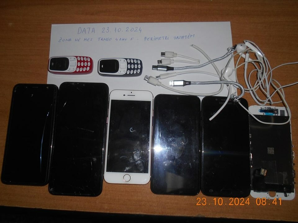 Pas kontrollit të detajuar, u gjet një qese e mbyllur, brenda së cilës, në një pako qumështi, ishin fshehur 7 telefona, 1 ekran i iPhone 7, 6 adaptera, 1 palë kufje dhe substancë e dyshuar narkotike.