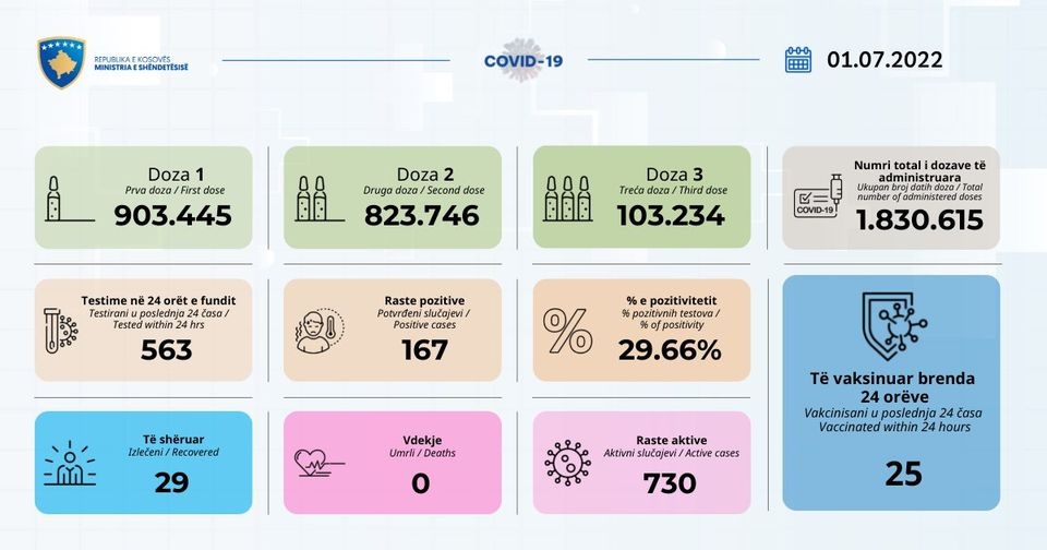 Nga 563 testime, 167 qytetarë kanë rezultuar pozitiv me virusin COVID-19.