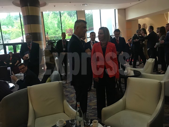 Sipas pamjeve nga atje shihet se shefja e BE’së, Federica Mogherini ka zgjatur muhabetin me Presidentin Thaçi, ndërsa një tavolinë më tutje ka qëndruar Vuçiq dhe Milorad Dodik.